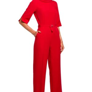 czerwony elegancki kombinezon na stójce z rękawami do łokcia