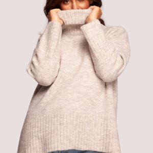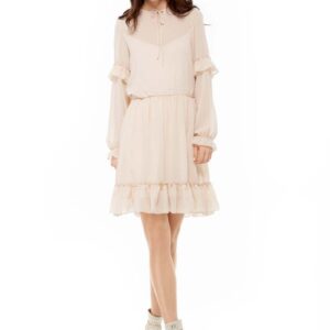 beżowa sukienka z delikatną falbanką z długim rękawem