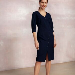 dopasowana sukienka z asymetrycznymi guzikami – granatowa