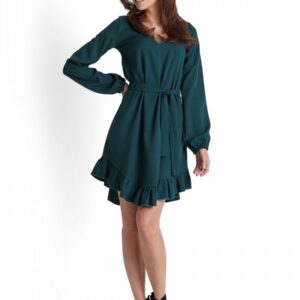 romantyczna zielona zwiewna sukienka z falbankami przewiązana paskiem