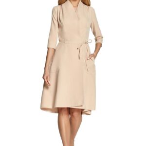 beżowa sukienka trapezowa z dekoltem na zakładkę