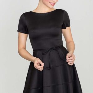 czarna trapezowa sukienka z wstawką w kwiatki