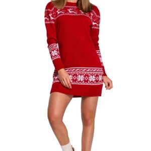 czerwona prosta swetrowa sukienka ze świątecznym motywem