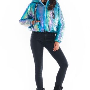 krótka pikowana kurtka z holograficznego materiału – niebieska