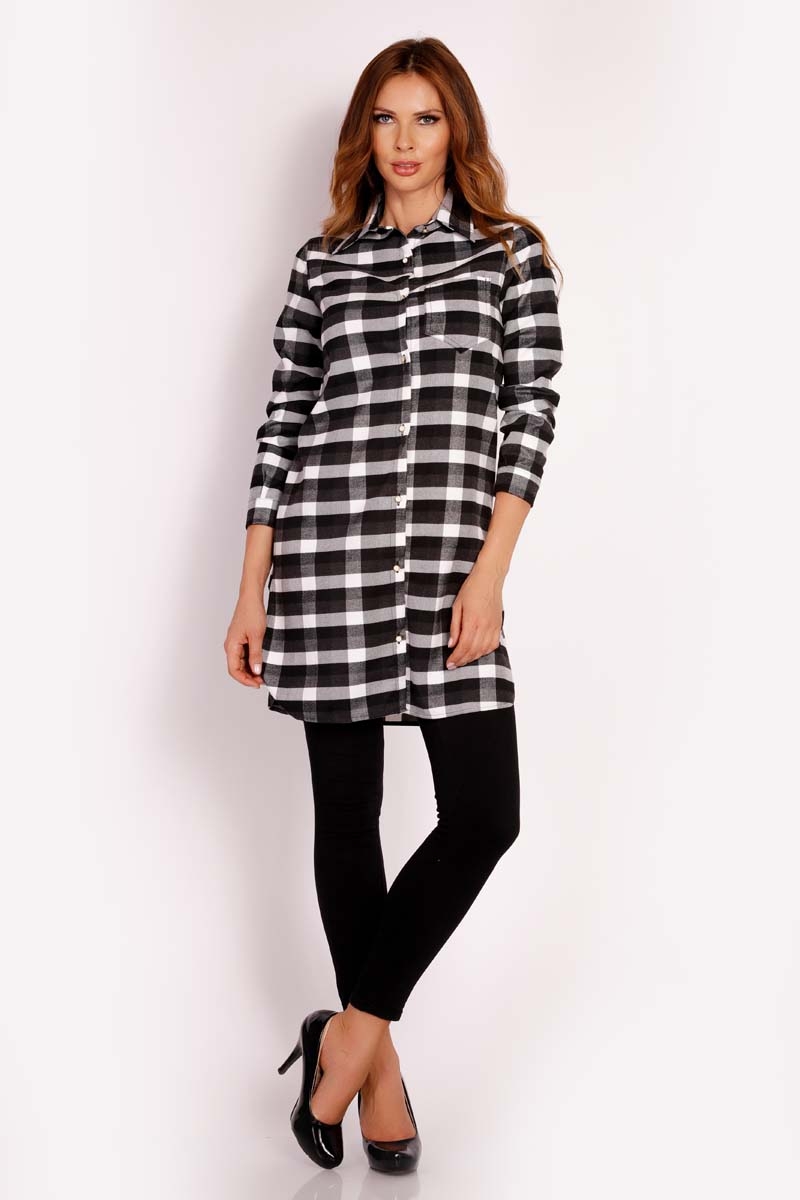 biało-czarna tunika koszulowa w kratę na zatrzaski
