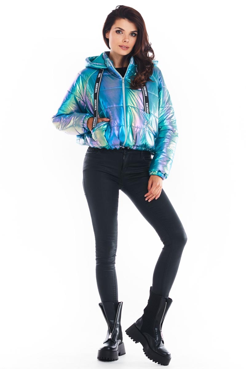 krótka pikowana kurtka z holograficznego materiału – niebieska