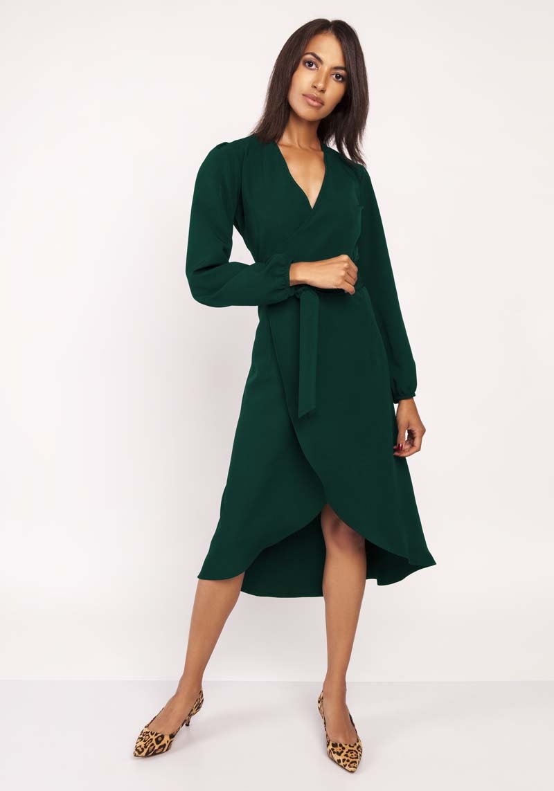zielona asymetryczna sukienka kopertowa z wiązanym paskiem