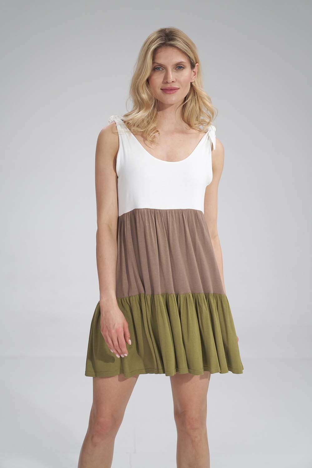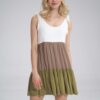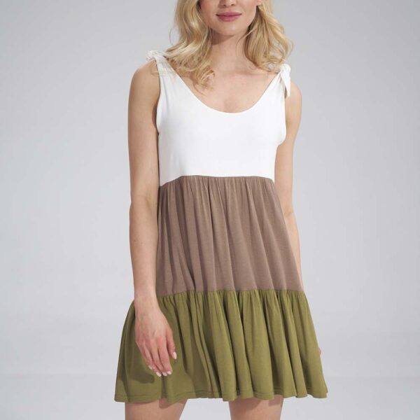 zwiewna sukienka wiązana na ramionach oliwkowa – mocca – ecru