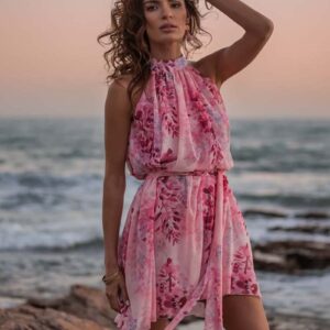 różowa luźna sukienka szyfonowa na stójce